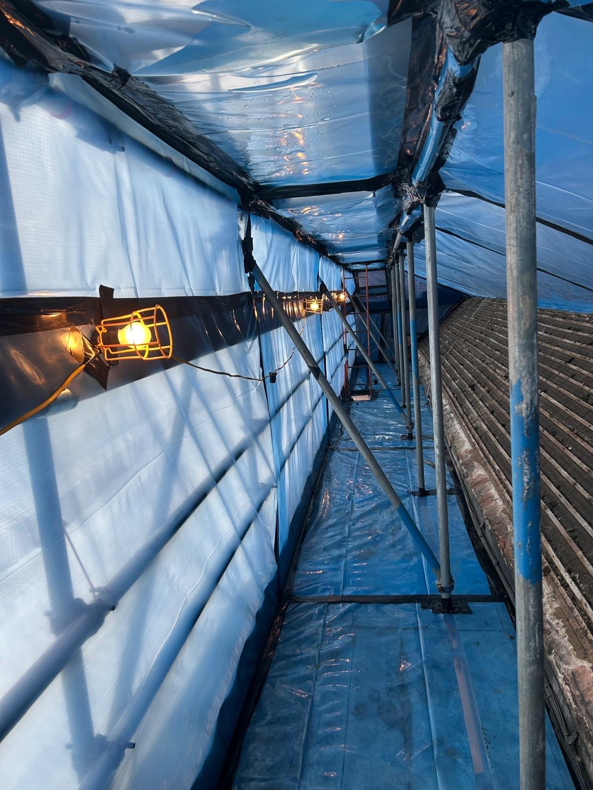 Close coordination ensured that roof coverings were removed methodically, allowing safe exposure and removal of the AIB without compromising structural integrity or weather protection.
