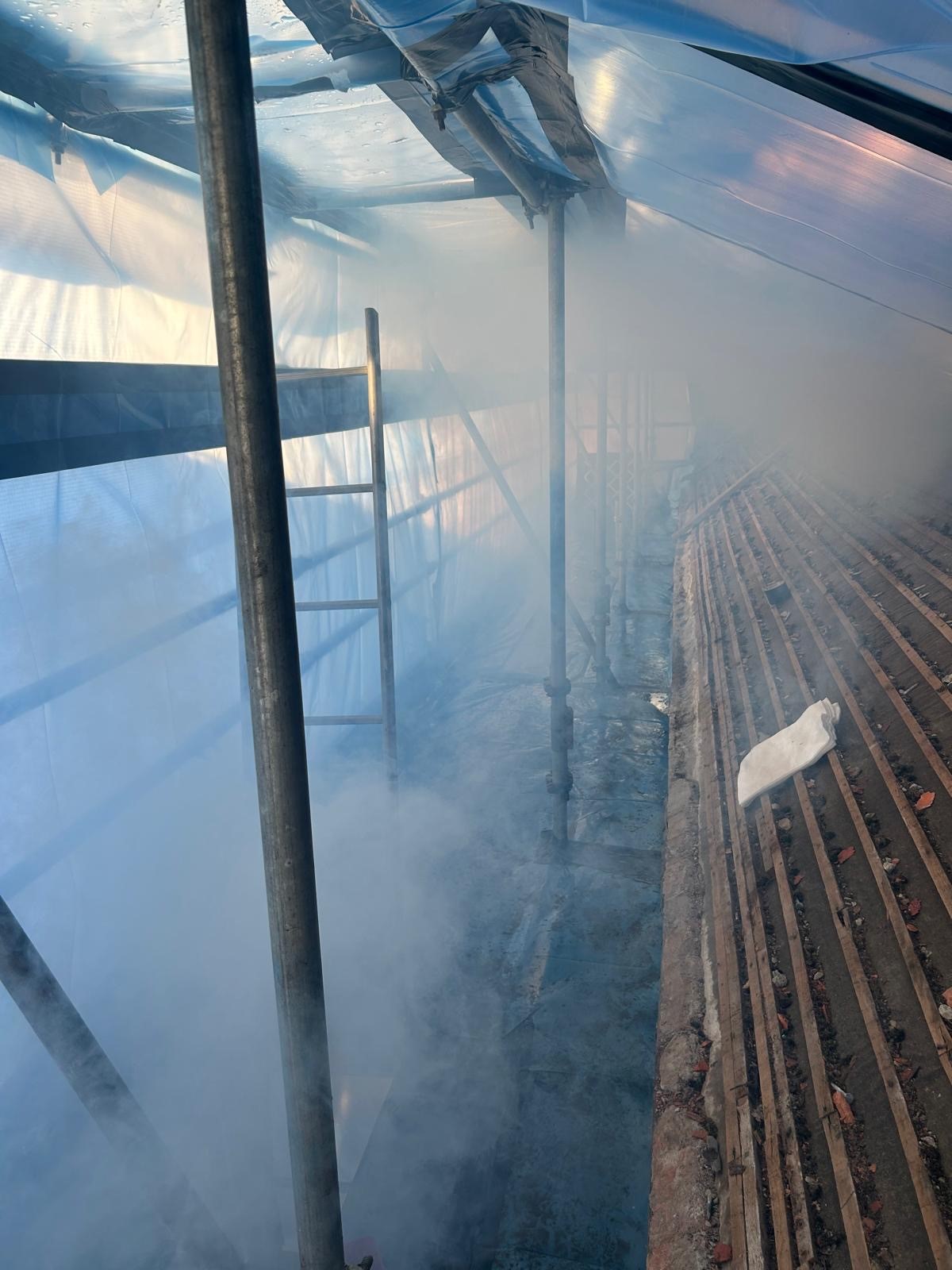This was an unusual installation, as the AIB panels were located above the roof rafters rather than below them — meaning access could only be achieved externally once the roof covering had been removed.