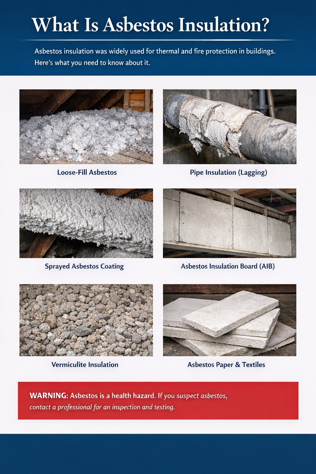 Asbestos insulation can look very different depending on how and where it was used. In many cases, it is hidden behind walls, ceilings, floors, and pipe coverings, making it difficult to identify without professional inspection.